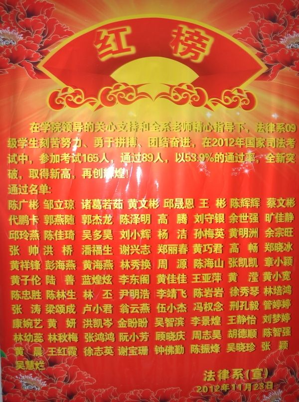 2012年11月21日,今年国家司法考试成绩公布。beat365法律系09级学生今年参加考试165人,通过89人,通过率达53.9%,同比去年增长13%,全新突破,再创新高。