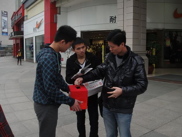 继上周 “学雷锋,献爱心”义卖报纸筹集善款活动后,刑技一大队的同学们于17日再次前往宝龙广场、汽车南站、金山万达广场、南后街等地进行义卖报纸活动。经过两天的义卖,同学们筹集到了2601.4元,并全部捐赠给闽侯善恩园孤儿院。  (刑技系 供稿)