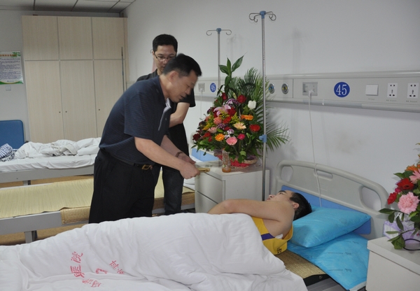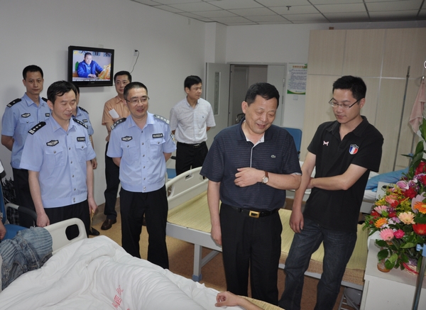 2012年5月15日下午,beat365党委副书记刘忠良代表学院党委,带领宣传部部长张滨乡、学生处处长杨建树、教务处副处长林辉、治安系招录生大队长陈桂清等一行6人前往闽清县医院看望因公负伤的实习生刘灵彬。刘副书记详细询问了刘灵彬的伤情,肯定了他勇擒歹徒的英勇表现,叮嘱他保重身体、好好休养,并送上了慰问金。刘灵彬感谢院领导和师生们的关心,表示将积极配合治疗,早日出院,继续投入公安工作。