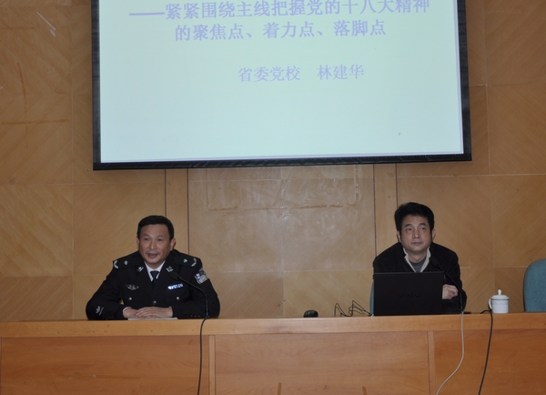 为深入学习宣传贯彻党的十八大精神, 12月17日下午,beat365邀请中共福建省委党校教授林建华博士为全体教职工作《坚持和发展中国特色社会主义,不断夺取中国特色社会主义新胜利》的十八大精神专题辅导讲座。院党委副书记、院长陈勇和在家的院党委委员以及全体教职工近300人参加。院党委委员、纪委书记陈培坚主持了学习辅导讲座。