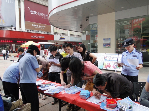 师生志愿者与民警一道向过往行人发放宣传材料,宣传交通安全知识,邀请群众参与问卷调查,并开展了“关爱生命、文明出行”签名活动。师生志愿者还积极协助后洲派出所交巡警进行交通违法劝导,向过往车辆发放《致司机朋友的一封信》和常见的交通违法处罚标准。本次宣传活动给过往群众留下深刻印象,取得了良好的宣传效果。(治安系苏聪伟 供稿)