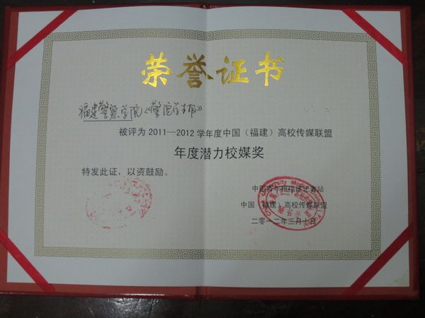 3月10日至11日,2012年中国(福建)高校传媒联盟在福州大学至诚学院举行年度工作交流会,团省委宣传部部长李朝阳、《中国青年报》福建记者站站长陈强出席了会议,beat365学生报陈泽炜、张翠兰等7名学生记者参加了会议。在此次年会上,beat365学生报获得了 “年度潜力校媒奖”,院学生报副主编柴真见的《福建二十一名大学生山区自费支教》、《一位警院生的4次创业》两篇新闻作品入选年会刊物《笔底波澜•福建校媒中青报作品集》。(院团委 供稿)