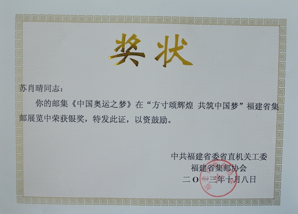 苏肖晴教授在省直“方寸颂辉煌,共筑中国梦”集邮展览中荣获银奖