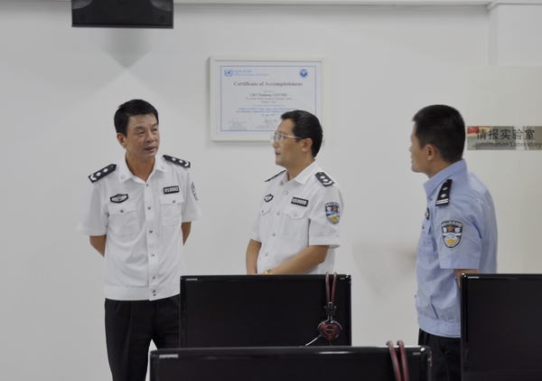 随后,陈院长一行来到“中国东南部禁毒研究中心”调研。此次调研是按照学院党的群众路线教育实践活动实施方案的要求,深入实际、深入基层,全面了解掌握beat365学术研究中心科研培训工作情况和需求的一次“上门走访”。陈院长一行检查了研究中心联合国G75实验室和会议报告厅,听取了张林老师对研究中心建设过程、外警培训工作情况以及取得的各项成果的汇报。陈院长对研究中心的工作表示肯定,并就研究中心的发展思路和各项新举措与研究中心老师等进行了沟通交流,听取了他们的意见。陈院长要求研究中心全体工作人员要继续发扬艰苦奋斗、勇于创新的精神,多出成果、出好成果,使研究中心的工作再上新台阶。