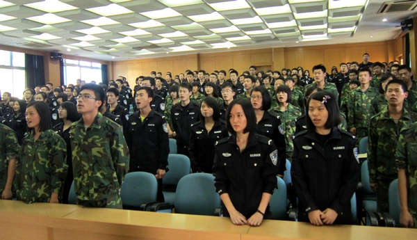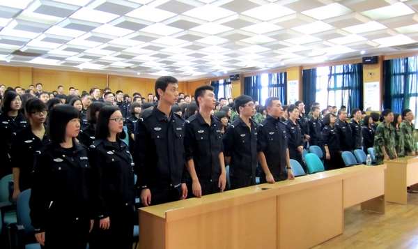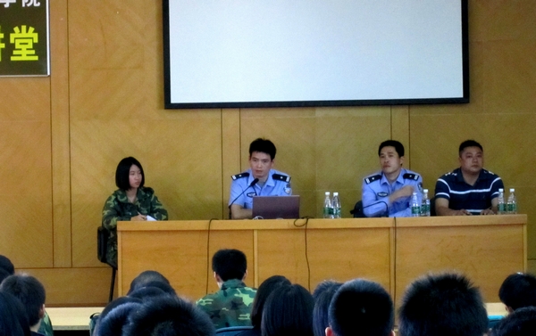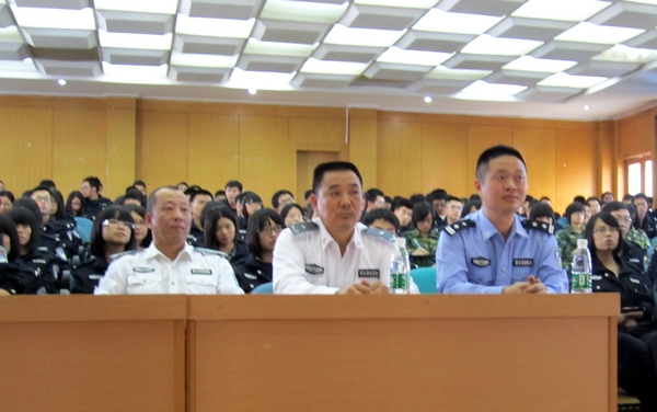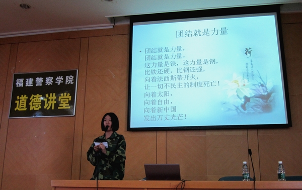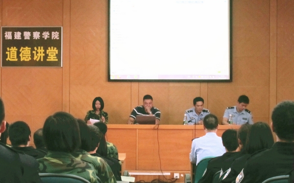 活动在积极向上、鼓舞人心的《团结就是力量》合唱声中拉开帷幕。接着,蔡勇同志以公安部三项纪律为切入点,结合自身经历和工作中的案例为师生讲述了一名警察如何结合当前的社情民意做好本职工作,提高自身道德修养,保持廉洁自律。林同旺同志通过《心态决定人生》的短片向大家讲解了心理调适的方式方法,使师生们学会了怎样在紧张高压的工作和生活环境中保持积极乐观的态度,从而不断实现自身价值。黄泉生同志则结合自身长期从事政工招警工作的经历,以“如何尽快做到从学生到民警的转变”为主题,有针对性地对同学们提出了珍惜在校时光、勤奋学习、练就过硬本领的希望。座谈结束后,主持人对他们的讲演做了精彩点评。最后,道德讲堂在同学们铿锵有力的《做一个有道德的人》的承诺声中圆满结束。