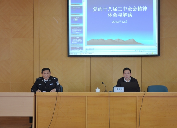 报告会上,黄建清处长介绍了党的十八届三中全会《决定》草案征求意见的过程,阐述了全面深化改革的重大意义,从体会感受、主要精神两个方面系统讲解了改革的重大主题、战略谋划、有力举措和新蓝图、新愿景、新目标、新思想、新论断、新举措。报告紧扣十八届三中全会主题,从全国到省内,从宏观到具体,既讲思路方向,又谈政策措施,同时结合我省实际,重点讲解了《决定》中关于推进法治中国建设和教育体制改革等内容,从理论和实践层面解读了十八届三中全会精神,为教职工进一步深化对三中全会精神的理解和认识提供了帮助。