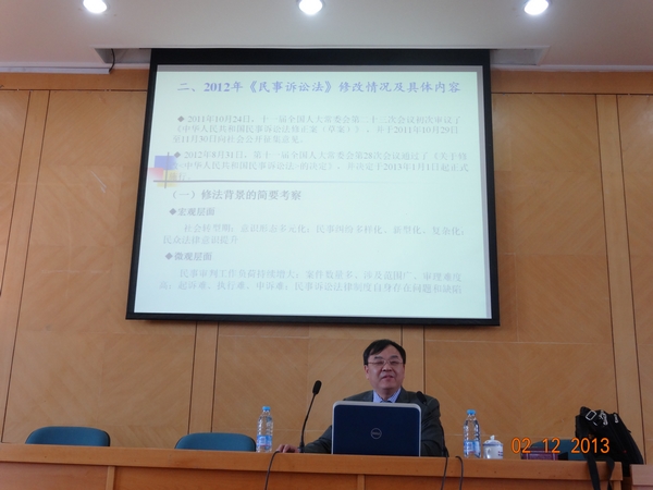 潘剑锋教授紧扣主题,介绍了我国民事诉讼法立法的历史沿革和2012年民诉法修改的具体内容,并与师生分享了他对民诉法修改的思考。潘教授的讲座用语幽默、形象生动,对中国民诉法见解深刻、独到,使师生们备受启发、受益匪浅。