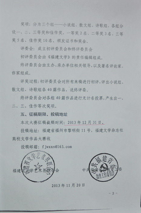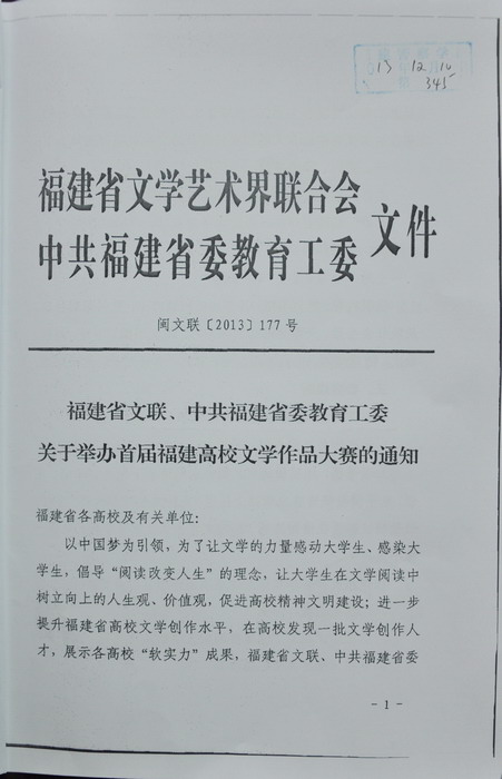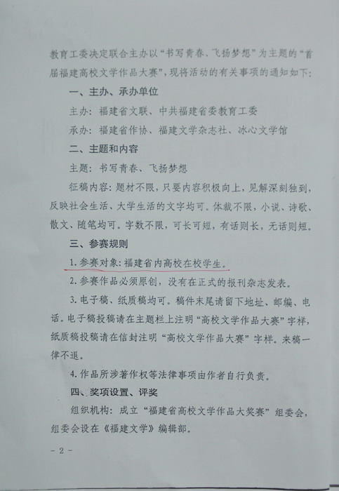 福建省文联、中共福建省委教育工委关于举办首届福建高校文学作品大赛的通知