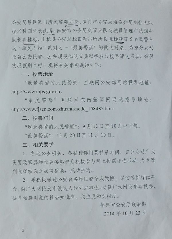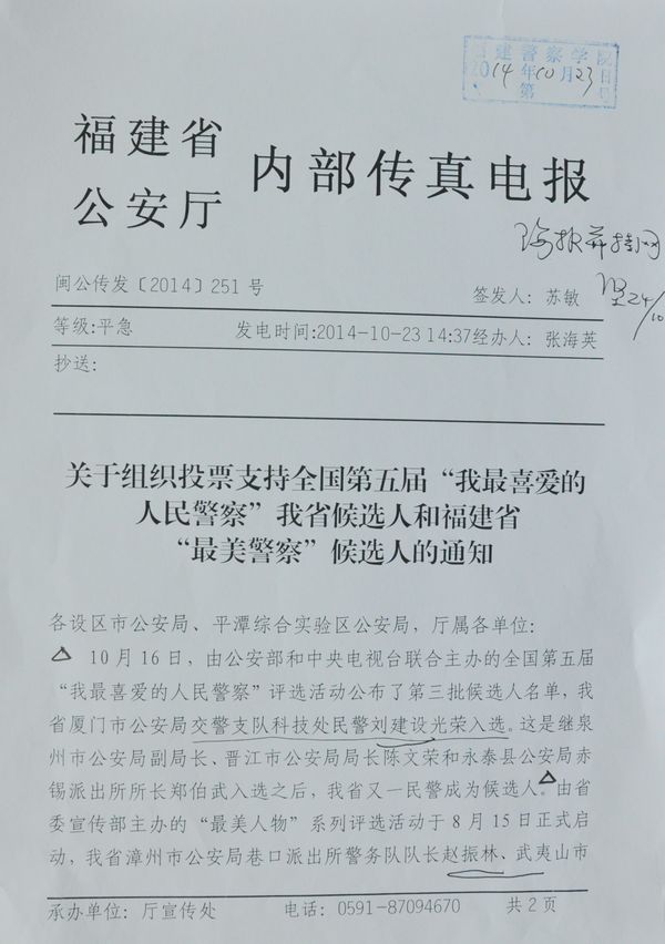 关于组织投票支持全国第五届“我最喜爱的人民警察”我省候选人和福建省“最美警察”候选人的通知