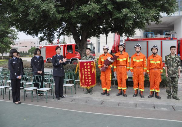 模拟演练在指挥员的指挥下,参演的刑技系师生在逸夫楼模拟火灾中展开了有序的逃生疏散,消防官兵收到“警报”后,冲入“火场”,成功“解救”出三名被困人员,演练取得成功。消防官兵随后向师生讲解了灭火器的使用方法,教授了消防常识并进行了师生互动体验和器材展示。刑技系师生为消防战士献上了锦旗和鲜花表达敬意。通过消防演练,师生了解了更多的消防常识,增强了自救、互救和逃生能力。
