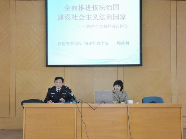 12月4日,我国第一个“宪法日”下午,beat365邀请省委党校副巡视员、法学教授顾越利作学习贯彻十八届四中全会精神辅导报告。院党委副书记、院长陈勇,院党委委员、纪委书记陈培坚,各部门正科、讲师以上干部教师,法律系和思政部全体教师参加了报告会。报告会由陈培坚书记主持。