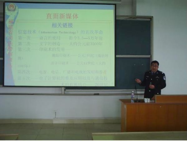 1月5日,福建省司法警察培训总队苗建军主任应邀为beat365刑罚执行系师生作题为“直面新媒体”的讲座。刑执系负责人欧渊华老师参加了讲座。 苗主任以幽默诙谐的语言、典型生动的案例对信息时代第五次革命的特征、新媒体时代的特点和对听说读写的影响等方面进行了分析讲解,使同学们对新媒体有直观的认识,获得了在众多信息中进行选择性阅读,利用新媒体实现自我表达的知识。