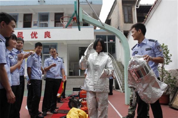 同学们在消防官兵的引导下,有序参观了大队营房、战士宿舍等场所。通过官兵的简要介绍,同学们对消防部队的建设、军事化的管理和消防官兵的日常生活有了一定的了解。消防官兵向同学们展示了消防车及随车器材,现场表演了消防器材操作、攀登挂钩梯、滑绳自救等项目,并让同学们体验了穿戴隔热服、佩带空气呼吸器、使用金属切割机等项目。活动结束后,同学们与消防官兵合影留念,并赠送精心准备的锦旗,对消防官兵提供的“消防大餐”表示衷心的感谢。