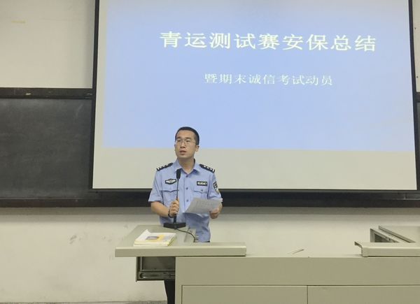 6月7日晚,侦查一大队召开青运会测试赛安保工作总结暨期末诚信考试动员会。 会上,各安保志愿者小组负责人分别上台发言,介绍了此次安保工作的经验和体会。邱吉文大队长肯定了安保工作志愿者的良好表现,指出不足之处,要求同学们加强学习,提高素质,为迎接10月份青运会正式赛安保任务做好准备。随后,会议进行了期末诚信考试动员,邱大队长介绍了学院关于期末考试工作的部署和要求,以及考试舞弊的处罚规定,要求全体同学认真学习、诚信考试。