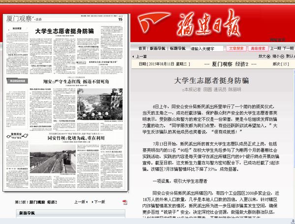 今年暑期,计算机系2014级网络安全监察专业学生林伟鸿加入了厦门市公安局同安分局新民派出所“大学生暑期反诈骗志愿队”。林伟鸿与其他10名队员每天值守在辖区内的9个银行网点开展防骗宣传。在民警的指导配合下,林伟鸿成功拦截两起诈骗案件,为人民群众挽回了经济损失,揭露和打击了诈骗犯罪。其所在的志愿队因成功拦截多起诈骗案件,成效显著,获得了大学生勤工俭学专项基金。《福建日报》报道了该志愿队的事迹。