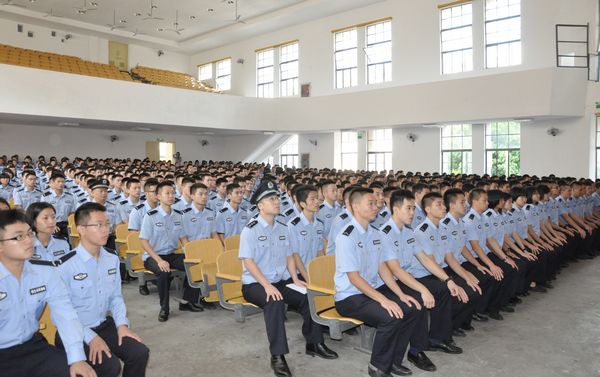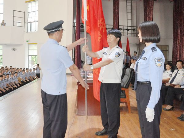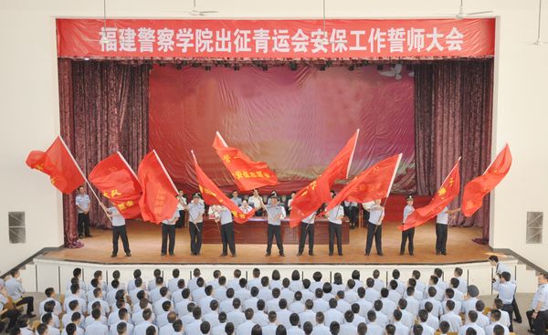 随后,大会举行庄严的授旗仪式。参加安保志愿工作的学生大队长整齐列队,依次上台。院党委游晔书记郑重地将安保队旗分别授予各大队长。大队长挥舞红旗,场下掌声雷动,充分激发了师生坚决完成青运会安保重任的意志。大会在雄壮的《人民警察之歌》中结束。