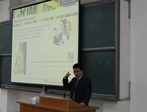 傅教授以悉尼科技大学为例,从微量物证、毒品定性定量、指纹显现、DNA、仪器检测、气体传感器以及法化学等方面的研究发展介绍了近年来澳大利亚物证技术的发展,展示了自己在生物化学、毒物学等方面的研究成果,并就物证技术知识学习等有关问题进行了交流,使同学们了解国际前沿的学术知识,增强了学好专业知识的积极性。