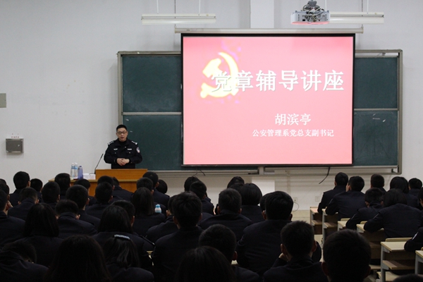 为落实《党章》要求,加强思想建设,3月27日晚,公管系党总支副书记胡滨亭为全系学生党员和入党积极分子作《党章》学习辅导讲座。胡副书记围绕什么是《党章》、为什么学习《党章》、公安院校青年学生如何贯彻落实《党章》等问题,深入浅出地解读了《党章》的主要内容和精神实质。