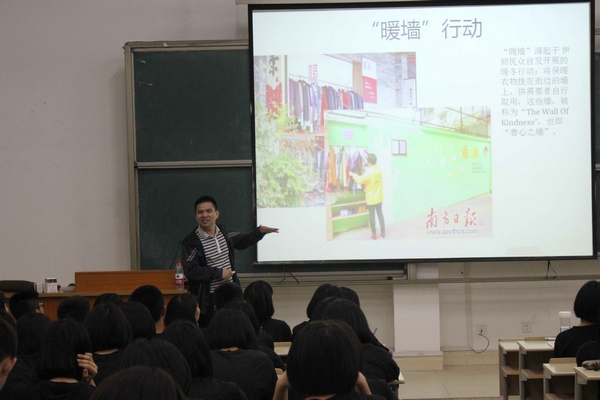 5月16日晚,公管系邀请福建师范大学温谋富老师为15级新生及“义工联盟”成员开设“善行—对慈善行为的若干认识”讲座。 温老师结合自身从事慈善活动的经历,从慈善有力量、慈善的渊源、对慈善现实的审视、如何开展慈善活动等四个方面对慈善理念进行了阐述,生动活泼地传递了正能量,引起了同学们的共鸣,使同学们对慈善有了更加全面的认识,提高了从事慈善活动的愿望。