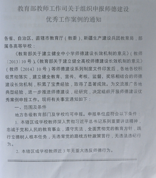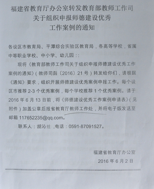 福建省教育厅办公室转发教育部教育工作司关于组织申报师德建设优秀工作案例的通知