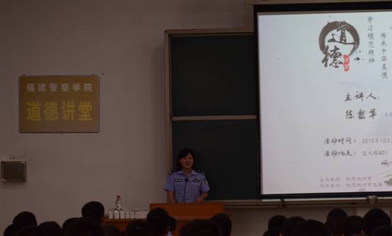 10月24日下午,刑执系邀请全国司法系统二级英模、福建省女子监狱民警陈黎华为2015级监狱学专业学生作“学习模范精神,传承中华美德”专题讲座,讲座由系副主任欧渊华主持。讲座中,陈黎华老师结合工作经历,通过介绍谈心、加深了解等与服刑人员相处的技巧,传授了改造犯人的方式方法。讲座使学生理解合格的监狱民警不仅需要坚韧的意志,更需要对职业的热爱。