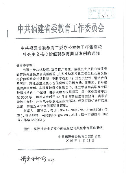 中共福建省委教育工委办公室关于征集高校社会主义核心价值观教育典型案例的通知