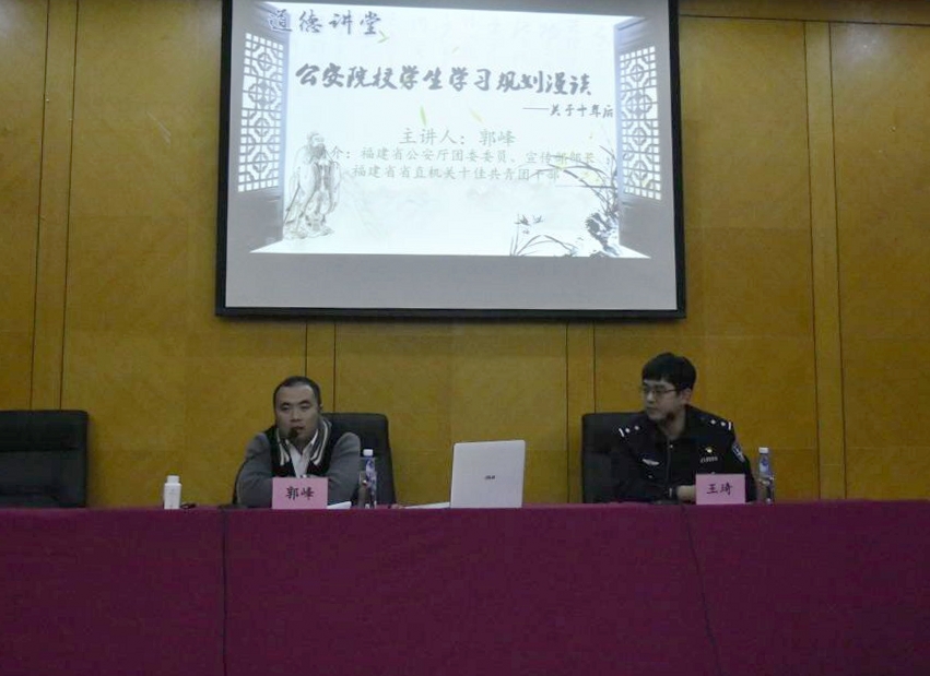 为提高学生职业规划能力,明确大学学习方向,根据学院“道德讲堂”活动计划安排,3月29日晚,法律一大队邀请省公安厅团委宣传部长郭峰为同学们开设“关于十年后”的主题学习规划专题讲座。郭峰部长围绕挖掘自我潜能、开拓人生视野、提高自身综合素质和职业竞争能力等问题作了深入浅出的讲解,帮助大家正确认识“自我”,明确未来发展方向,做好人生规划,实现人生目标。