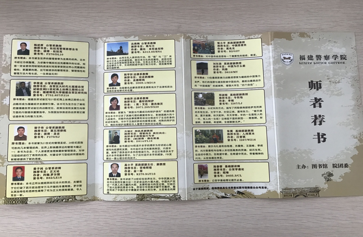 为营造多读书、读好书的良好校园氛围,近日,图书馆、团委举办“老师带你读好书”活动。活动得到了学院各系部的广泛关注和参与,共收到8个系部34位老师推荐的140本图书。老师推荐的部分书籍编印成“师者荐书”小册子进行了宣传推广,其他荐书则通过图书馆微信公众号进行推送。活动为全院师生提供了一个交流、讨论与分享书籍的平台,激发了广大学生的阅读热情,推动了校风学风建设。
