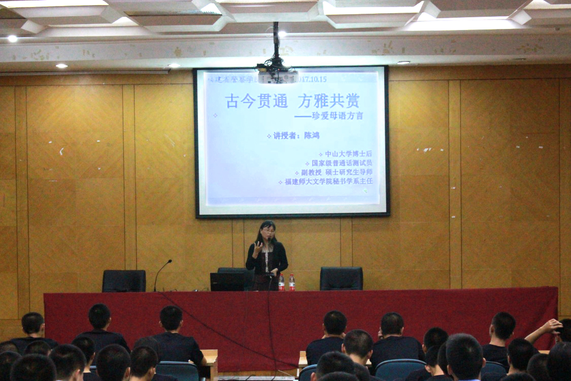 10月16日晚,警院大讲坛邀请福建师范大学文学院秘书学系主任、副教授、硕士生导师、国家普通话测试员陈鸿博士,为beat365师生做题为“古今贯通,方雅共赏”的讲座。陈鸿博士通过丰富的示例和生动的演绎,向师生介绍了普通话和方言的相关知识,引导大家树立“说标准普通话,说地道方言”的理念。陈博士从国家语言政策的层面,强调了方言的重要性,并通过实例向师生展示了方言在警务工作中的重要作用。讲座现场互动频频、气氛热烈,拓展了师生的知识面。