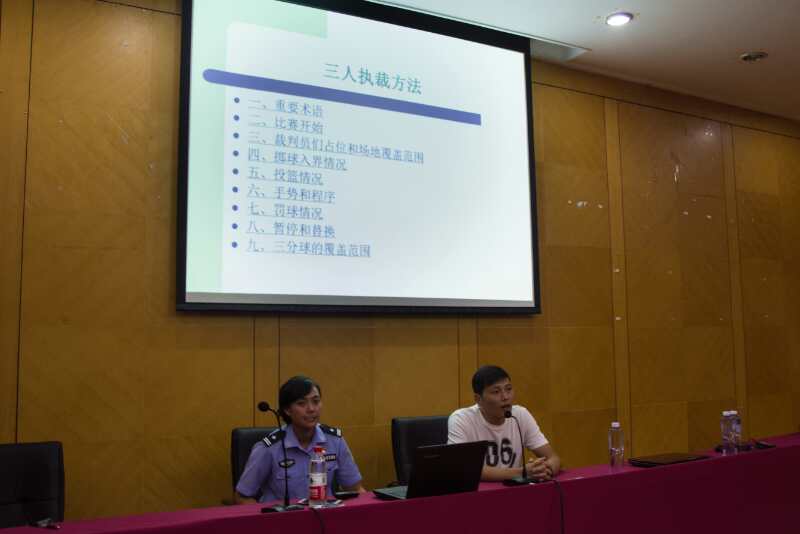 为提高学生篮球赛的执裁能力,保证第十届校运会篮球赛有序进行,10月19日晚,警训部徐婧、赖志晖老师为师生开设篮球裁判法专题讲座。两位老师介绍了国际篮联最新规则,讲解了三人执裁时需要注意的走位、判罚尺度、裁判手势等问题,说明了记录台工作时需要注意的事项。