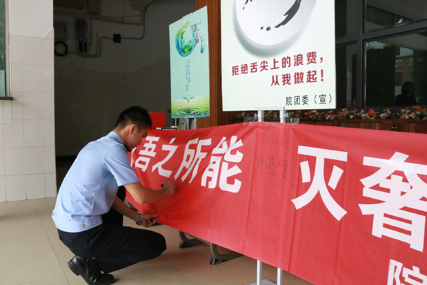 为加强生态文明教育,引导学生树立环保的意识,10月20日,院团委开展了环保主题签名活动。活动中,同学们在写有“节吾之所能,灭奢靡之风”横幅上前驻足并郑重签名。活动引导同学们从小事做起、从自己做起,逐步养成节约的行为习惯;积极践行光盘行动,将节粮行动落到实处,最大限度减少食品浪费;养成及时关水关灯习惯,杜绝长流水和长明灯现象。