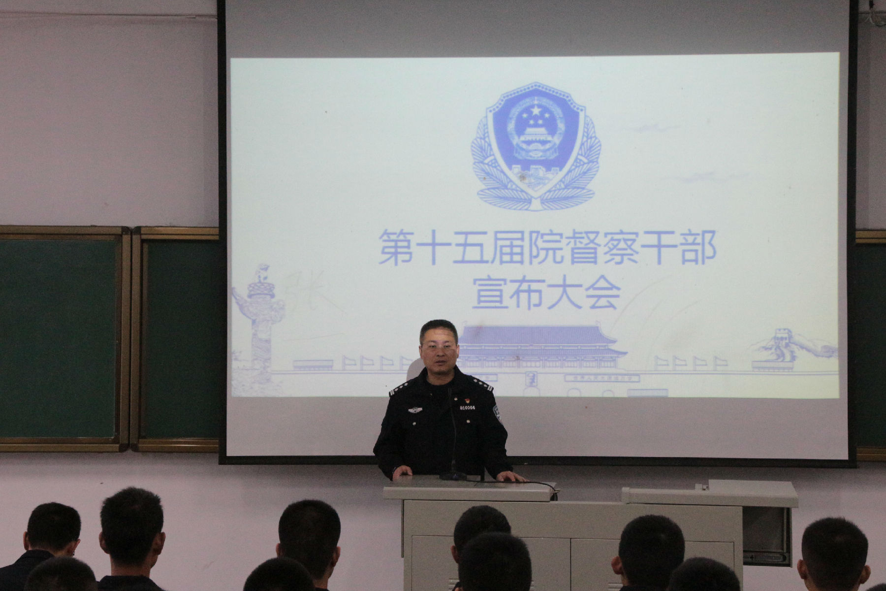 新学期新气象,3月7日,院学生警务督察队召开第十五届换届大会。学工处副处长胡向东、学管科科长林廉锐以及全体学生督察队成员参加了大会。会上,林廉锐科长宣读了第十五届院督察队学生干部名单。新任队长陈麟同学发表了任职感言。胡向东副处长对退队的老队员表示感谢,对新任干部表示祝贺,要求督察队秉承“忠诚、勤奋、严谨、求实”的校训,继承督察队的优良传统,加强队伍建设,健全工作制度,提高队伍整体素质,更好地为学院警务化管理服务。