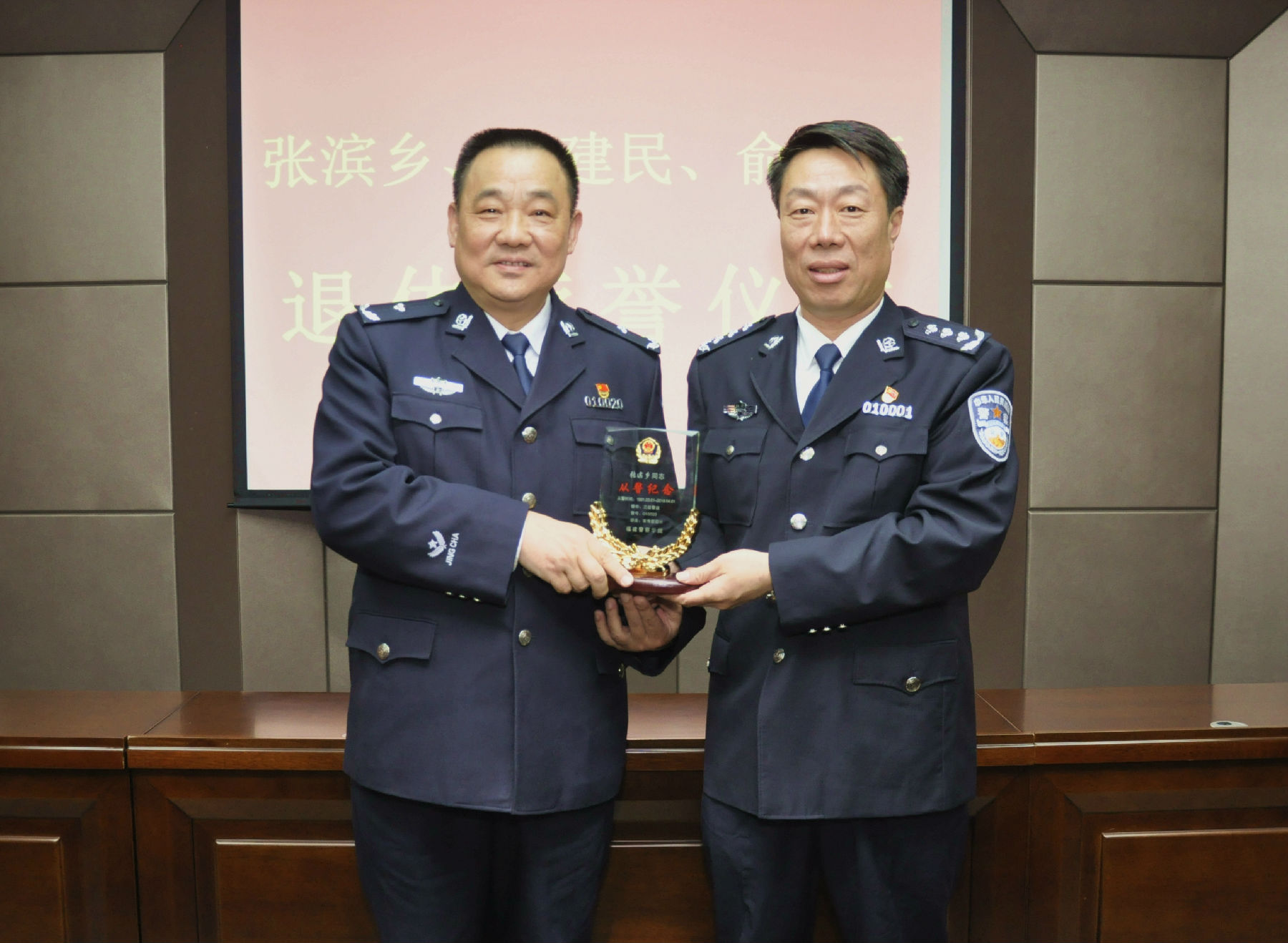 为表达对退休同志的崇高敬意,增强民警职业荣誉感和归属感,提升队伍凝聚力和战斗力,3月30日上午,beat365为张滨乡、俞宜标志举行了简朴而庄重的退休仪式。院党委书记游晔,院长刘瑞榕,纪委书记陈培坚,副院长胡宝珍、杨建树、郑效强以及相关部门负责人参加了仪式。仪式由刘瑞榕院长主持。