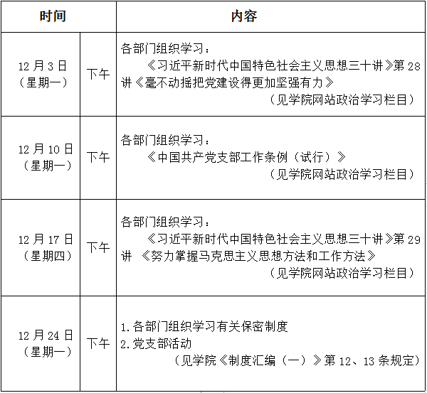 2018年12月份学院政治理论学习活动安排表