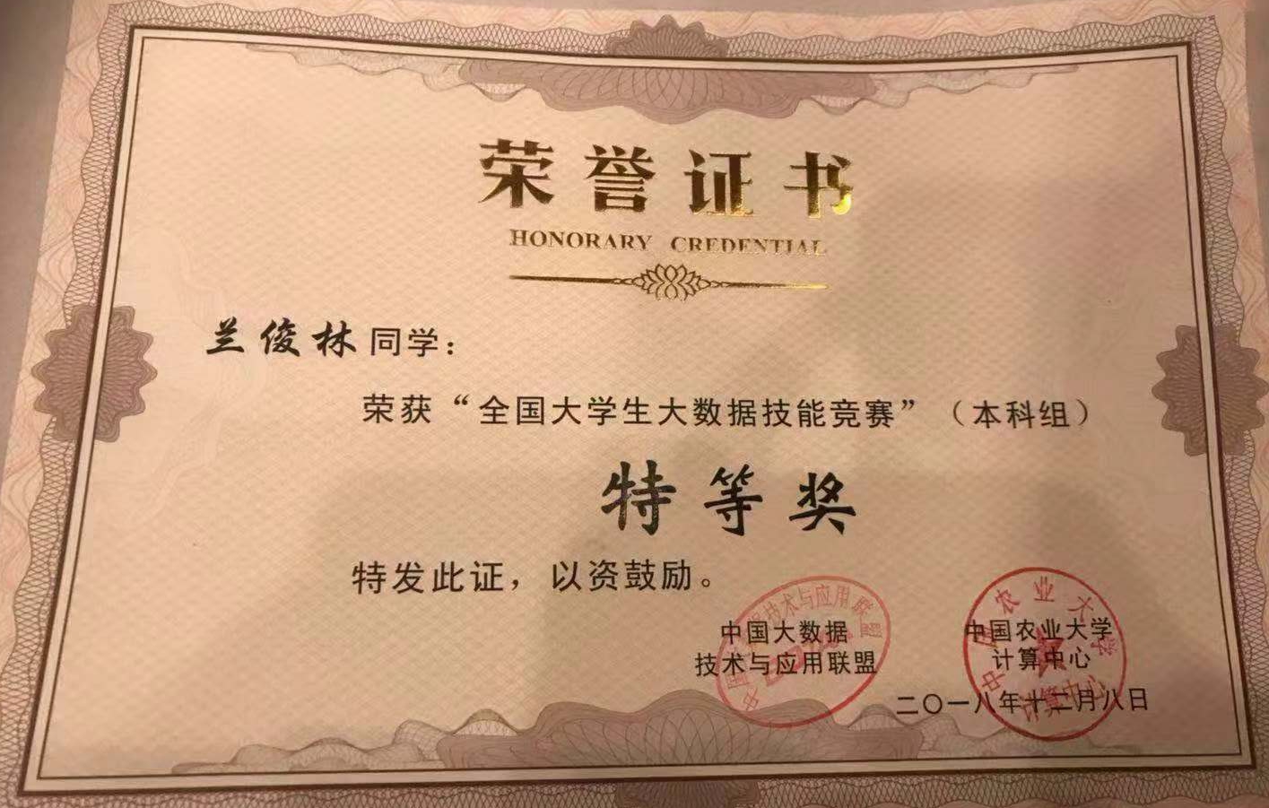 12月8日,由中国大数据技术与应用联盟、中国农业大学主办的首届全国大学生大数据技能竞赛在北京举办,beat365学生兰俊林在计算机系老师张美璟博士的带领下参加了本科组比赛,取得总分第一名,荣获特等奖,为学院赢得了荣誉。