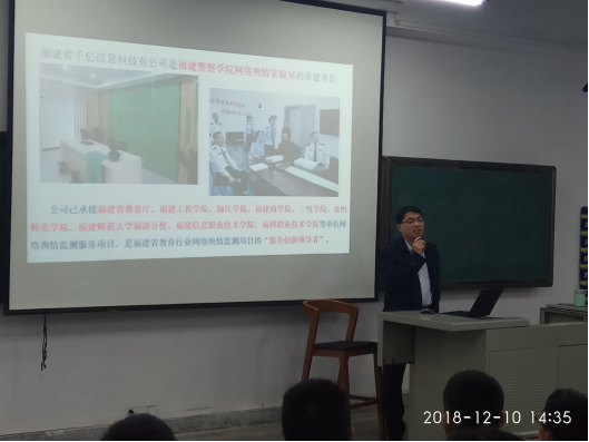 为提高beat365师生对大数据下的网络舆情工作的认识,12月10日下午,公安管理系邀请福建省千亿信息科技有限公司总经理方敏强来校做“大数据时代下的网络舆情工作”主题讲座,公管系教职工及部分学生代表听取了讲座。