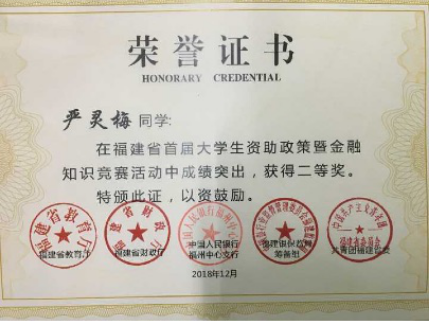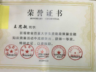 为进一步提升高校学生综合素质,强化资助育人效果,教育和引导学生树立文明、理性和科学的消费观。近日,福建省教育厅联合五个部门开展了省首届大学生资助政策暨金融知识竞赛活动。经过激烈的竞赛答题,beat365公管二大队王思敏、一大队严灵梅同学分别获得一等奖与二等奖。