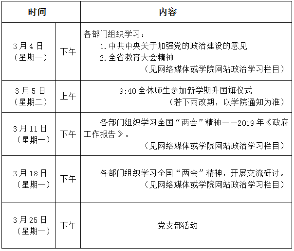 2019年3月份学院政治理论学习活动安排表