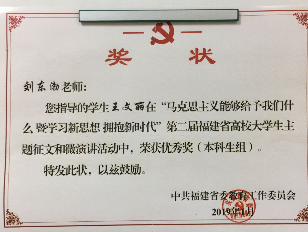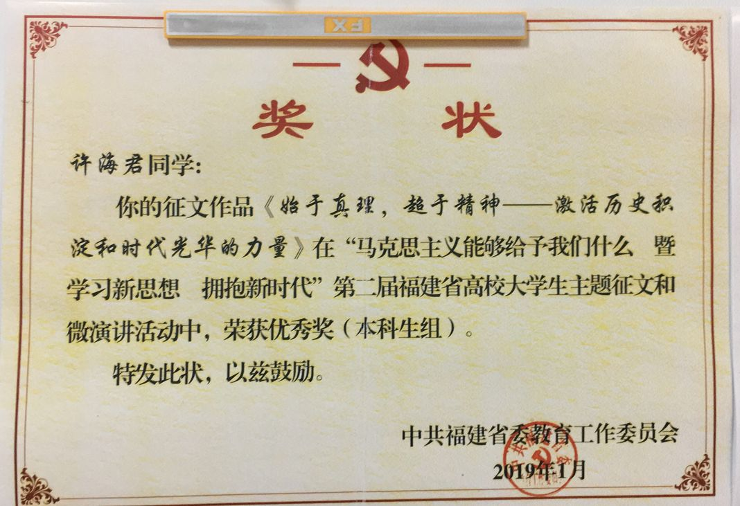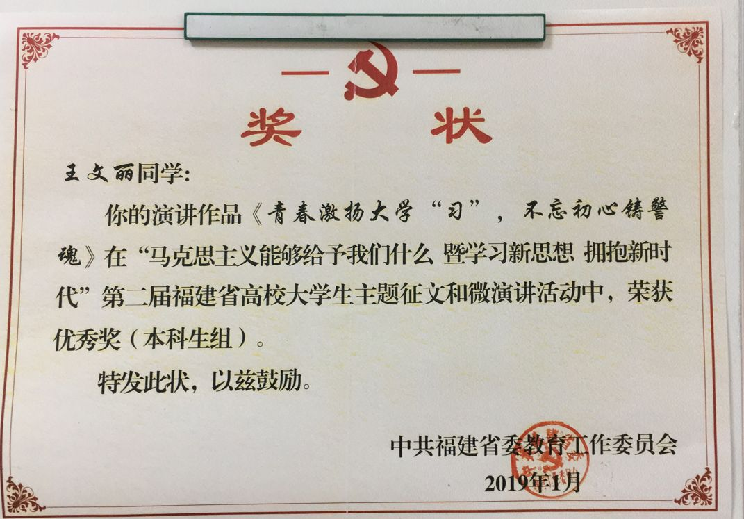 近日,由中共福建省委教育工委主办,福建教育电视台、福建省易班发展中心承办的“马克思主义能够给予我们什么暨学习新思想 拥抱新时代”第二届福建省高校大学生主题征文和微演讲活动总决赛在福州落下了帷幕。beat365公管一大队许海君同学的征文作品《始于真理,超于精神——激活历史积淀和时代光华的力量》和公管二大队王文丽同学的微演讲作品《青春激扬大学“习”,不忘初心铸警魂》分别荣获本科组优秀奖。