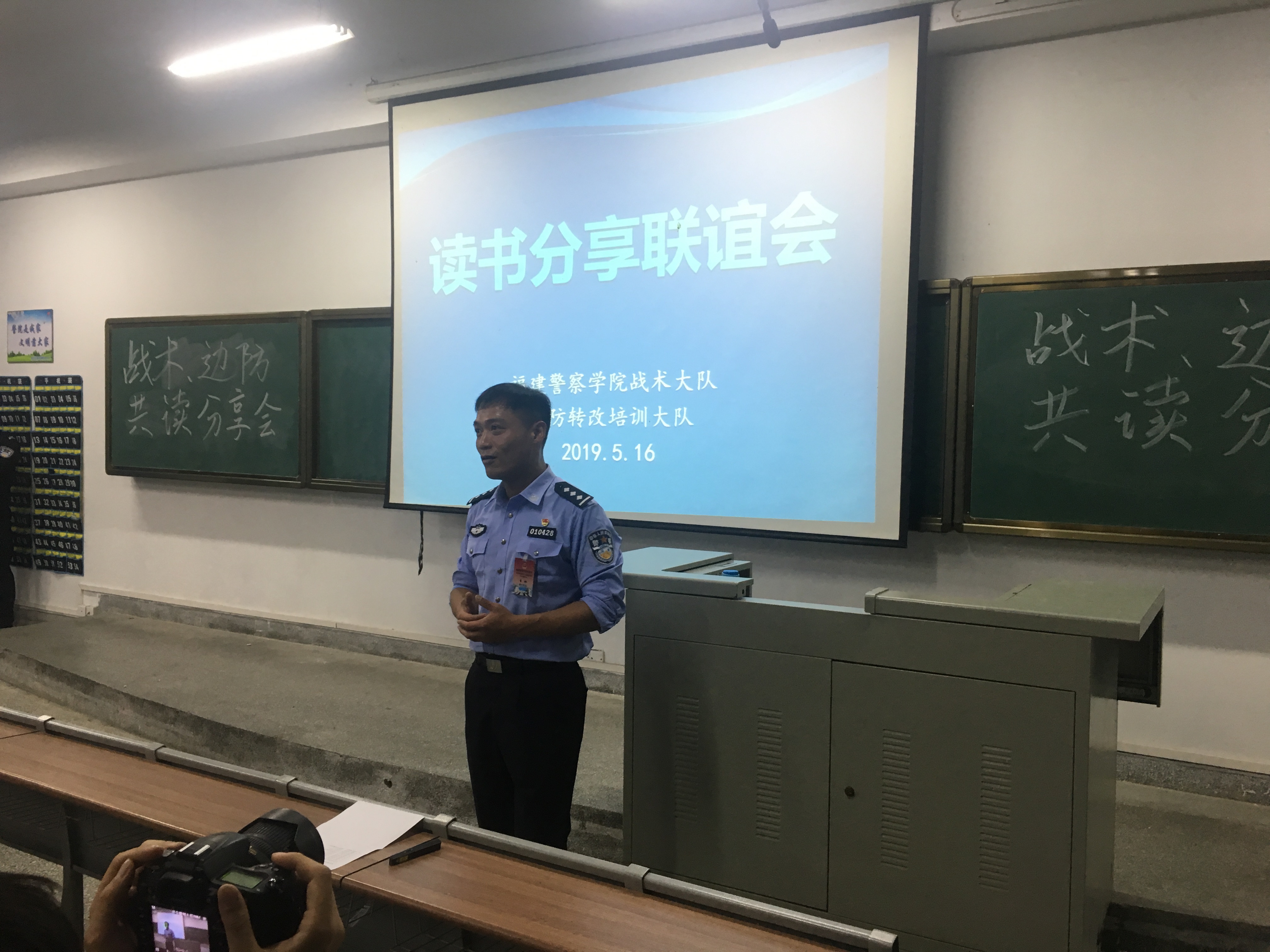 5月16日晚,战术大队与边防转改培训班举行读书分享会双向交流活动,转改培训班学员和战术大队16级学生参加了本次活动。在活动中,双方代表围绕《活着》《易经》《乌合之众》等书籍,以生动有趣的语言,分享了自己的阅读心得,现场互动频繁,气氛热烈。最后,转改培训班学员大队副大队长李冰对本次活动做了精彩点评。