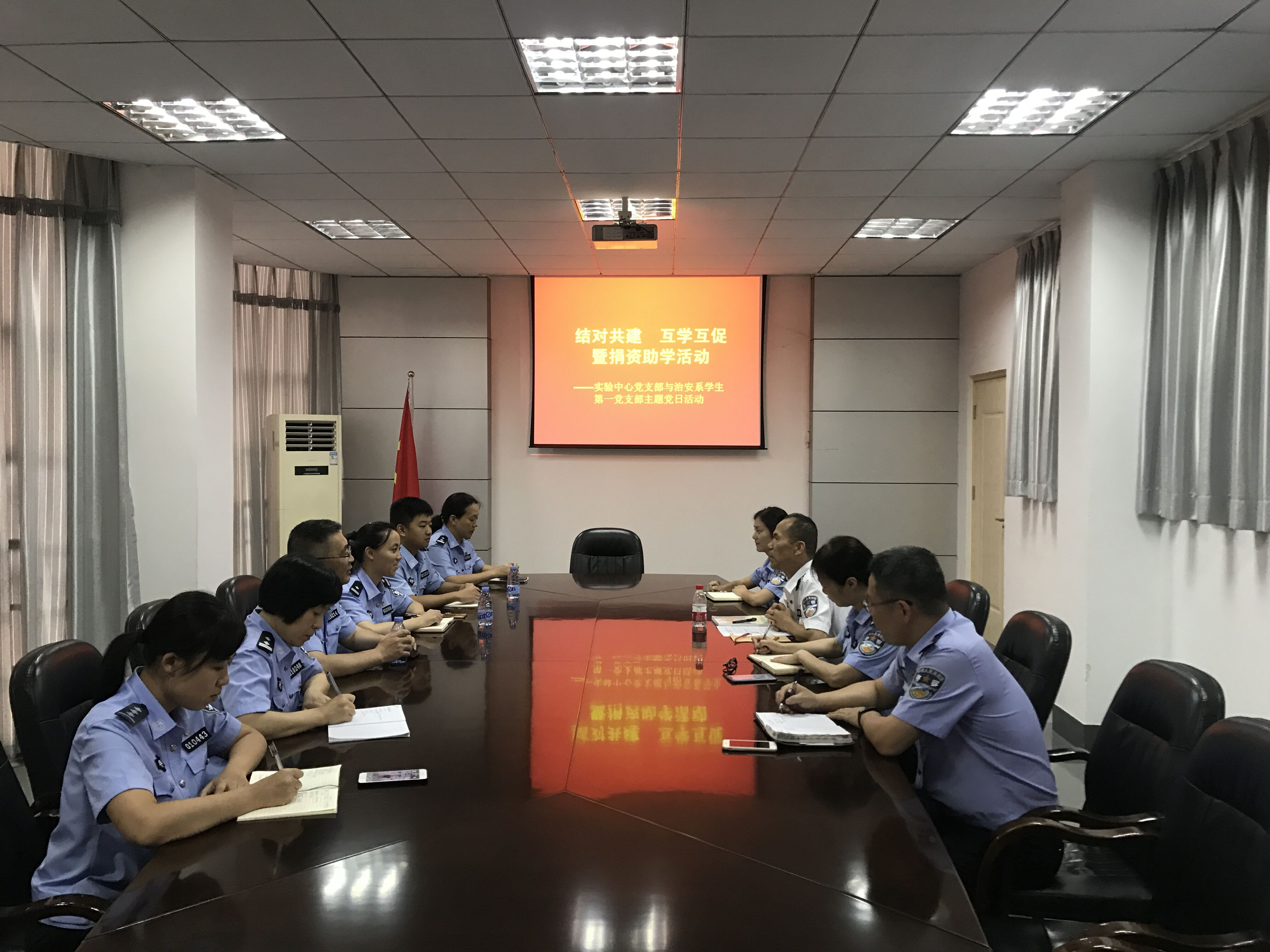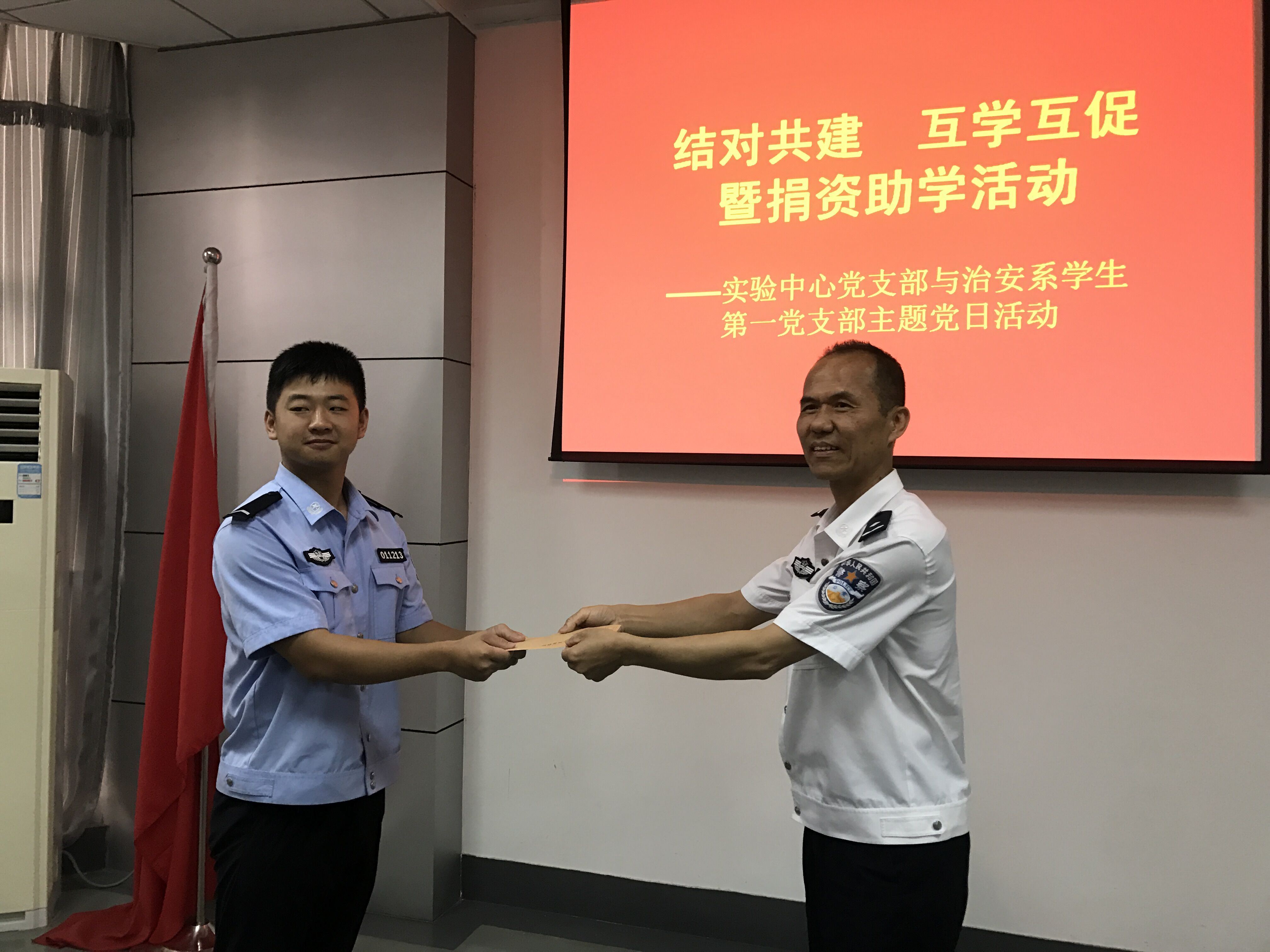 6月6日下午,根据党建结对共建协议,实验中心党支部和治安系学生第一党支部开展了捐资助学活动。实验中心党支部书记何松国将支部党员捐资助学款发放给接受帮扶的贫困学生,并鼓励他们努力学习、克服困难、立志成才、回报社会。随后,双方党支部交流了党建工作经验,并就进一步提升共建的参与性、创新性和实践性,积极推动“不忘初心、牢记使命”主题教育活动入心入脑进行了深入的探讨。