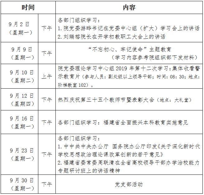 2019年9月份学院政治理论学习活动安排表