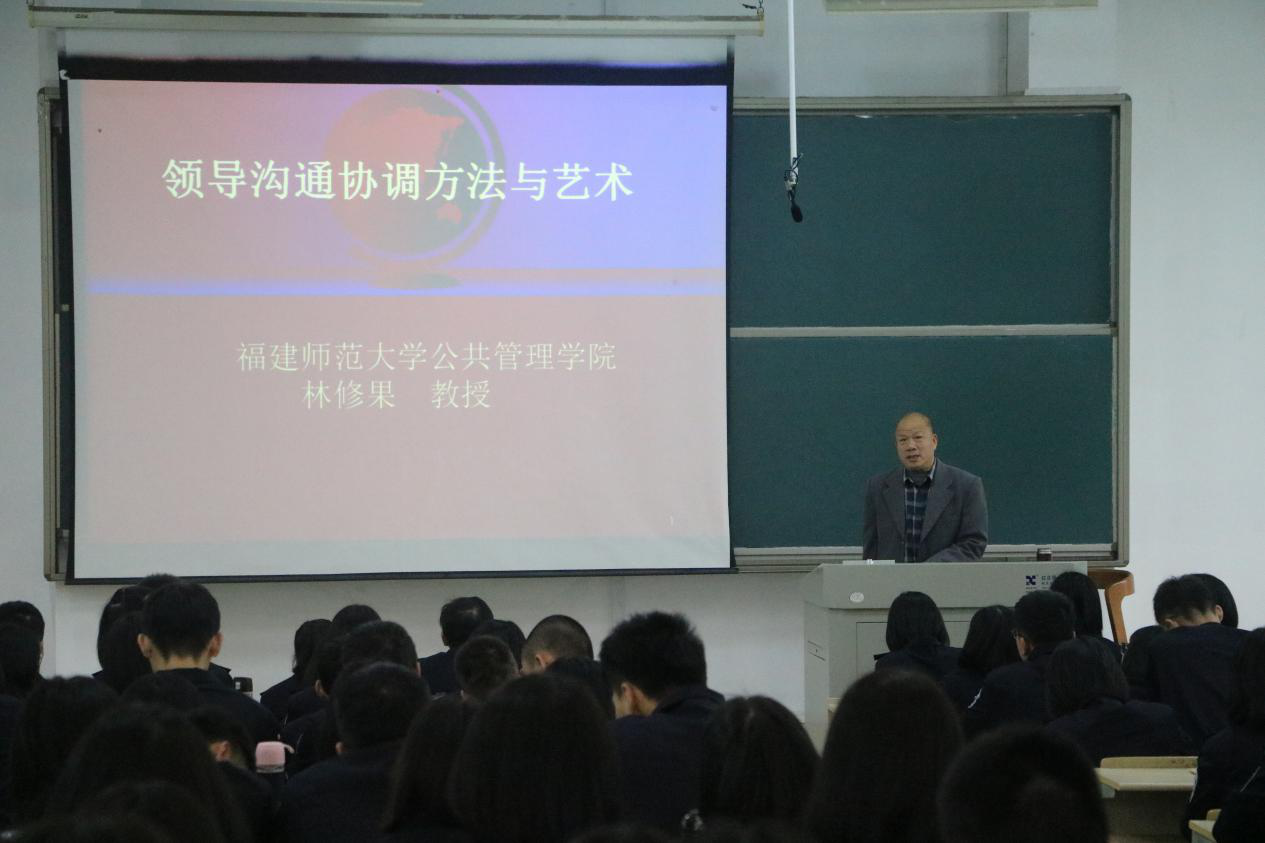 11月28日下午,福建师范大学博士生导师、国家行政学教学研究会常务理事林修果教授应邀来到beat365作题为“领导沟通协调方法与艺术”的讲座。讲座在逸夫楼401举行,公管系近200名师生参加。