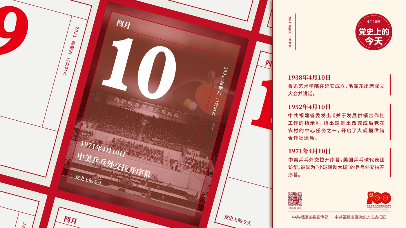 1938年4月10日鲁迅艺术学院在延安成立,毛泽东出席成立大会并讲话。1952年4月10日中共福建省委发出《关于发展供销合作社工作的指示》,指出这是土改完成后党在农村的中心任务之一,开启了大规模供销合作社运动。1971年4月10日中美乒乓外交拉开序幕,美国乒乓球代表团访华,被誉为“小球转动大球”的乒乓外交拉开序幕。