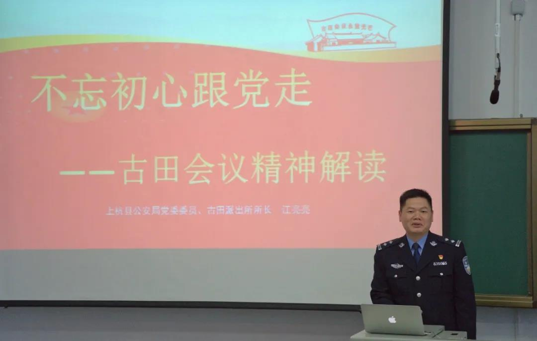 课上,江亮亮所长以《不忘初心跟党走—古田会议精神解读》为题,重点介绍了古田会议的历史背景、内容、意义,上杭县公安局古田派出所的发展历程与政治建警教育模式。他号召同学们要牢记使命、担当作为,传承红色基因、铸牢忠诚警魂。