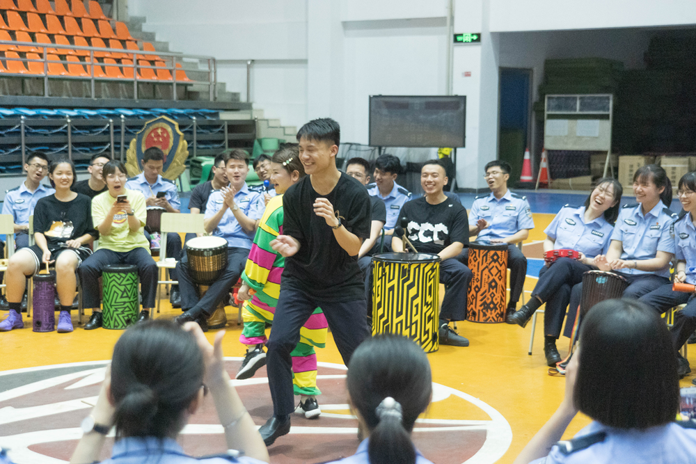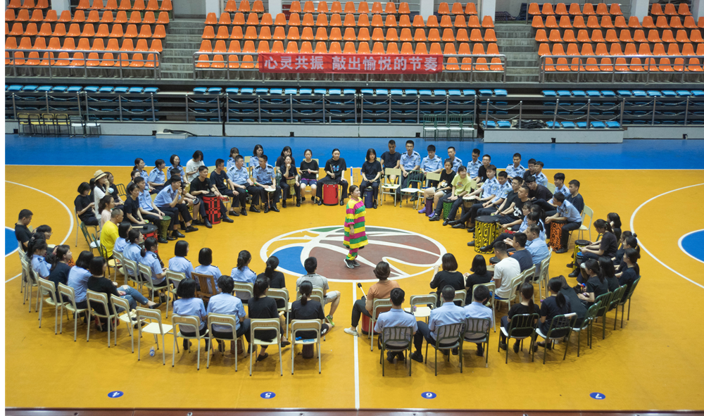 活动中,徐艺端、张琳两位导师带领同学们做了放松游戏,介绍了鼓圈乐器,并通过手势和声音,引导现场参与者敲击鼓,不断变幻节奏,把鼓声和节拍融合在一起,即兴创造、演奏了一场交响乐。现场气氛活跃,学生、大队老师踊跃上台表演节目。