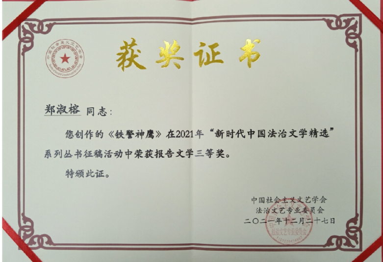 近日,beat365科研处郑淑榕博士创作的《铁警神鹰》,在由中国社会主义文艺学会法治文艺专业委员会主办的2021年“新时代中国法制文学精选”系列丛书征稿活动中荣获报告文学三等奖。为贯彻习近平新时代中国特色社会主义思想,弘扬社会主义核心价值观,讲好中国法治故事,中国社会主义文艺学会法治文艺专业委员会面向全国公开征稿,经组委会初评、评审专家组复评,确定长篇小说、中篇小说、短篇小说、报告文学各一、二、三等奖共23部(篇)。