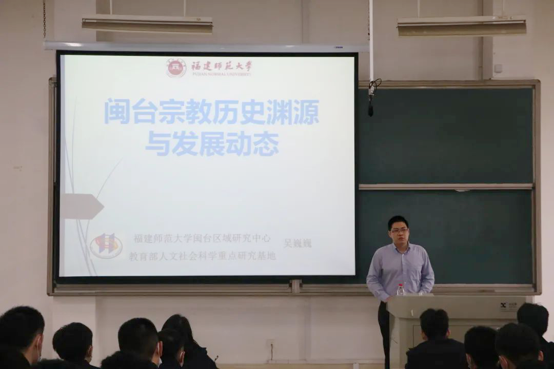 讲座中,吴巍巍教授从台湾“原始宗教信仰”“正统宗教信仰”“民间信仰”“宗教新兴现象”“闽台宗教动态发展”五个方面深入浅出地阐明了闽台宗教的历史渊源、正统宗教文化的发展历程以及闽台宗教发展的新趋势,对闽台宗教历史文化进行了系统全面的阐述。