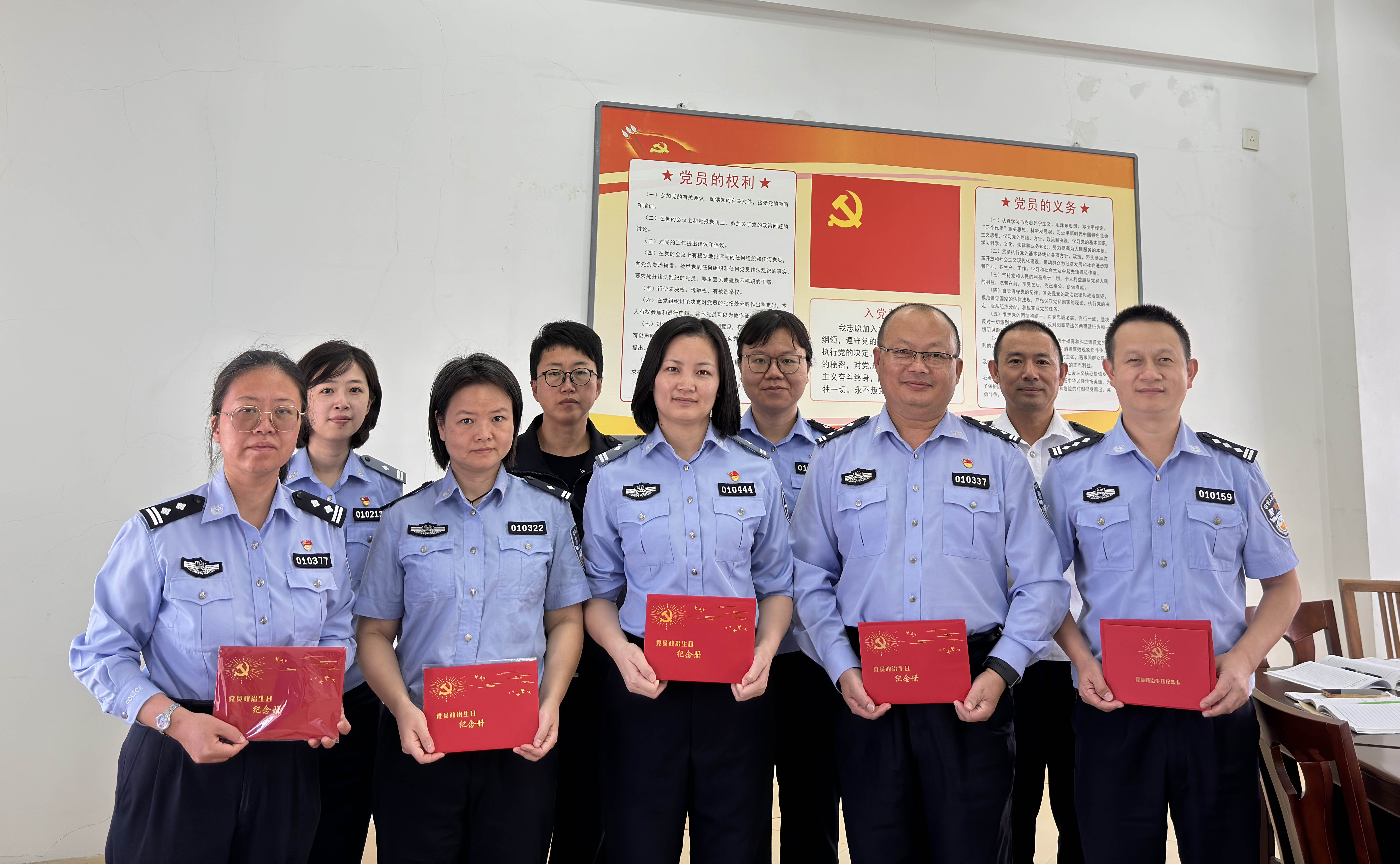 活动中,支部书记肖琳峰带大家集体学习了“第一议题”,传达学习了公安部、省公安厅会议精神。随后,全体党员同志齐唱《国际歌》,在雄壮的旋律中感受共产主义理想的崇高与神圣;面向党旗,紧握右拳,重温了入党誓词。党支部向党员送上了精心准备的“政治生日”贺卡。