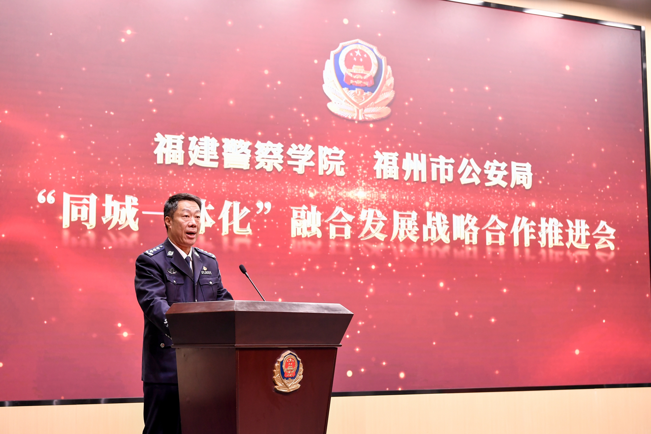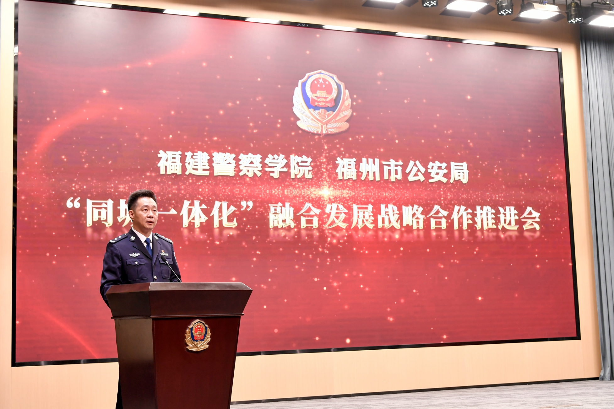 游晔代表学院对福州市局长期以来给予的大力支持表示衷心的感谢。他指出,2021年学院与福州市局正式签署“同城一体化”战略合作框架协议以来,双方坚持“人才共育、项目共研、专业共建、设施共用”,全面开展“八个一体化”建设,有力推进了学院教育教学改革建设和发展,有效提升了人才培养质量和办学水平,开启了校局同城一体化新模式的探索。他希望双方继续发挥好“前沿阵地”和“后方智库”的作用,聚焦服务国家重大战略、实战化导向和高质量发展,进一步在健全机制、协同创新、数据共享上下功夫,不断夯实合作基础、完善合作机制、放大合作效果、树立合作标杆,共同打造优秀公安人才的培养高地、警务科技的创新高地和打击犯罪的支撑高地,努力为培养党和人民忠诚卫士、推进公安工作现代化、建设更高水平“平安福州”作出新的更大贡献。